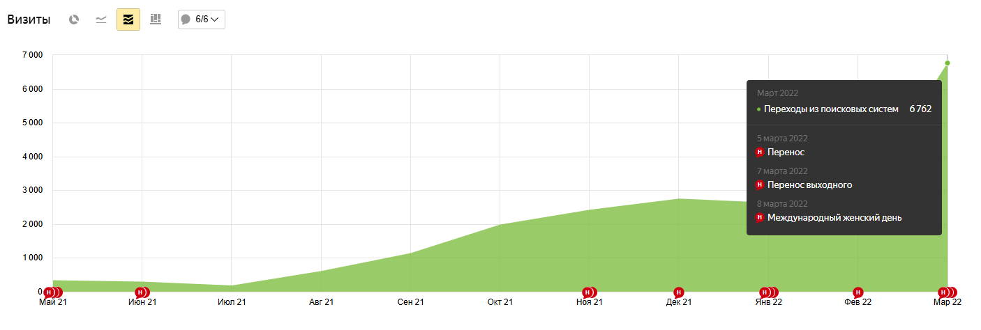 Результаты: На 2й месяц мы полностью завершили технические правки и первичную оптимизацию, с 4го месяца сайт начал уверенно подниматься из топ-50 сперва в топ-20, а далее и в топ-10. Через 8 месяцев источник "визиты из поисковых систем" сравнялся с контекстной рекламой по количеству входящих заявок и продолжает прирастать.