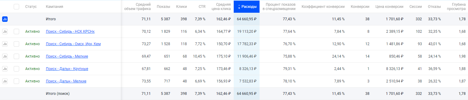 Результаты: По итогам первого месяца было получено 38 целевых обращений по цене 1700 рублей. Собственником компании принято решение сосредоточиться на домашнем регионе (Сибирский федеральный округ), работы по данному направлению продолжаются.